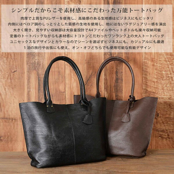 ■素材:材質PUレザー ■仕様内:ポケット×2 ■付属品:キーストラップ ■製造国:中国 ■サイズ:約H32×W52cm、マチ:約12cm、持ち手:約60cm ■重量:480g