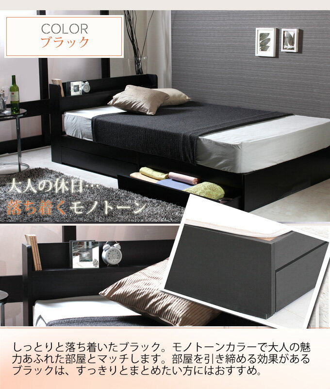 シンプルに見えても機能は豊富! ヘッドボードに棚があり、スマホやメガネ、目覚まし時計などのいつも使い小物を手元に置けます。