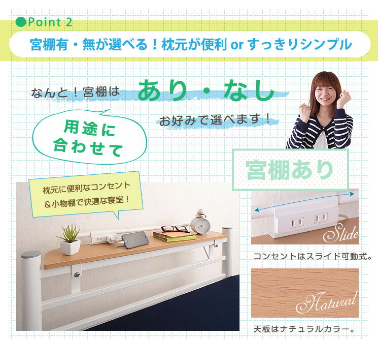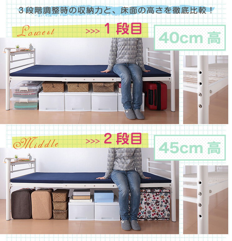 【商品名】3段階から高さが選べるパイプミドルベッド【CLEV】クレブ【サイズ】(約)幅100×218×80cm / 床下高さ40、45、50cm【素材】スチール【耐荷重】100kg【生産国】中国【カラー】本体:ホワイト 棚板:ナチュラル【梱包サイズ】本体:(約)103×110×23cm 宮棚:21×98×8cm※お客様組み立て※マットレスは付きません。