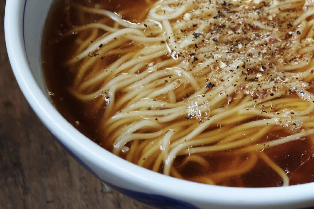 和風ラーメンスープは、利尻昆布、煮干し、削り節4種類を贅沢に使って出汁をとり、天然醸造のうすくち醤油や天然塩、本みりんといった選び抜いた調味料、宗像市で飼育されている放牧豚の肉からとったラード、天然醸造の濃口醤油をベースにしたかえし(醤油タレ)を合わせ、旨味たっぷりに仕上げました。