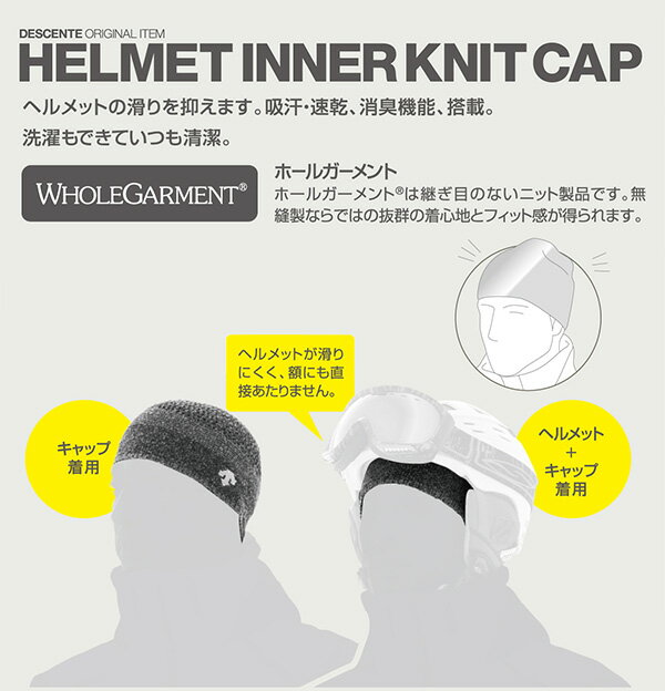 DESCENTE デサント ニット帽 ■HELMET INNER KNIT CAP/DCA-6113 〔ヘルメットインナー対応〕 FABRIC: バルキー綿混(アクリル57% 綿24% ナイロン12% ポリエステル6% ポリウレタン1%) ・HEAT NAVI ・WHOLEGARMENT ヘルメットインナー専用のニットキャップ。