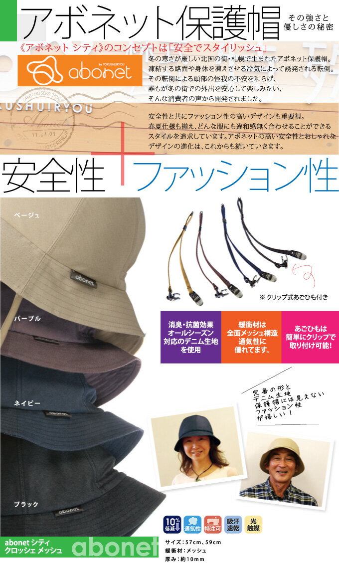 、 あごひもは簡単にクリップで取り付けが可能! 生産国 日本転倒予防・安全対策に!北国生まれのおしゃれな保護帽! 「保護帽 abonet [アボネット] シティ/クロッシェ メッシュ 」です。